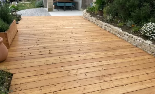 Réalisation d'une terrasse en bois et muret avec pierre d'Eyzahut (26)